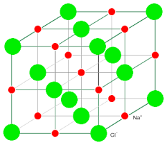 Uma coisa que se tem que ter em mente é que a ligação não envolve apenas dois átomos, mas sim vários átomos dois elementos que formam um aglomerado com forma geométrica definida, chamado de reticulo cristalino, característico dos sólidos. Para o NaCl, o reticulo tem a forma: